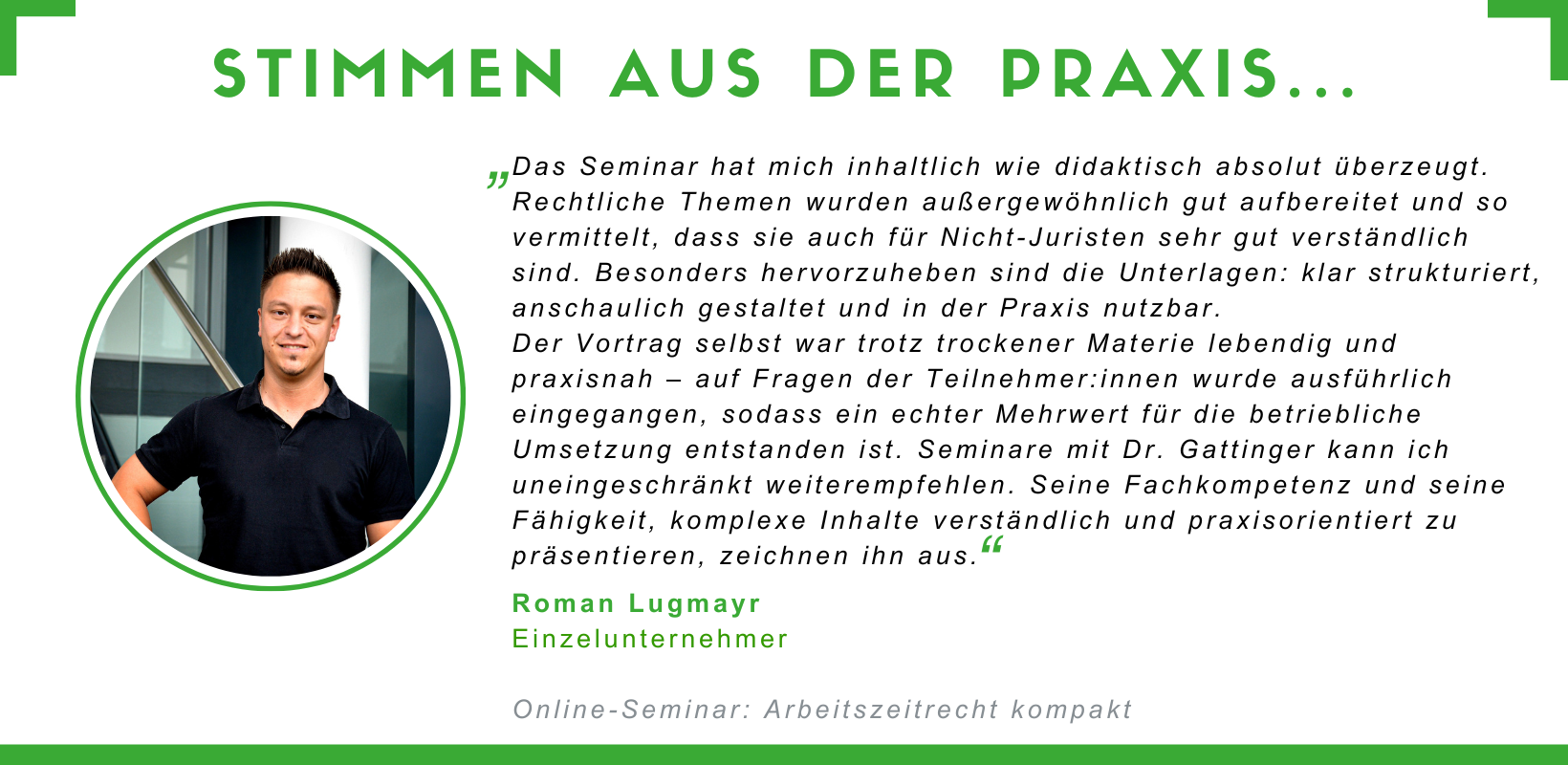 Die Einhaltung von Arbeitszeitgrenzen wird wegen des Lohn- und Sozialdumpings streng überprüft und bei Übertretung bestraft. Dieses Intensiv-Seminar klärt Sie über die aktuell gültigen Arbeitszeitgrenzen, sowie über alle erlaubten Möglichkeiten zu deren Flexibilisierung auf.