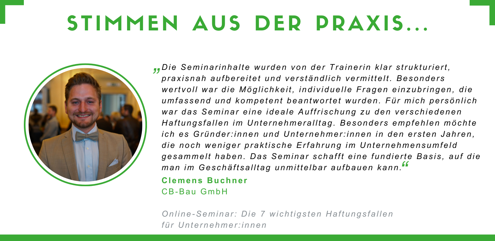Als Unternehmer:in sind Sie nicht nur wirtschaftlichen, sondern auch rechtlichen Haftungsrisiken ausgesetzt. Gerade Letztere lassen sich bei entsprechendem Fachwissen vermeiden bzw. vermindern. Dieses Seminar gibt Ihnen das nötige Grundwissen, um Haftungspotentiale in folgenden Bereichen zu reduzieren: Verletzung der Warnpflicht des Werkunternehmers, Gewährleistung, Mangelfolgeschäden, Produkthaftung und Rückrufverpflichtungen, Urheberrechtsverletzungen, Haftung für Angestellte, Subunternehmer:innen und sonstige Beauftragte sowie Haftungsfallen in AGB: