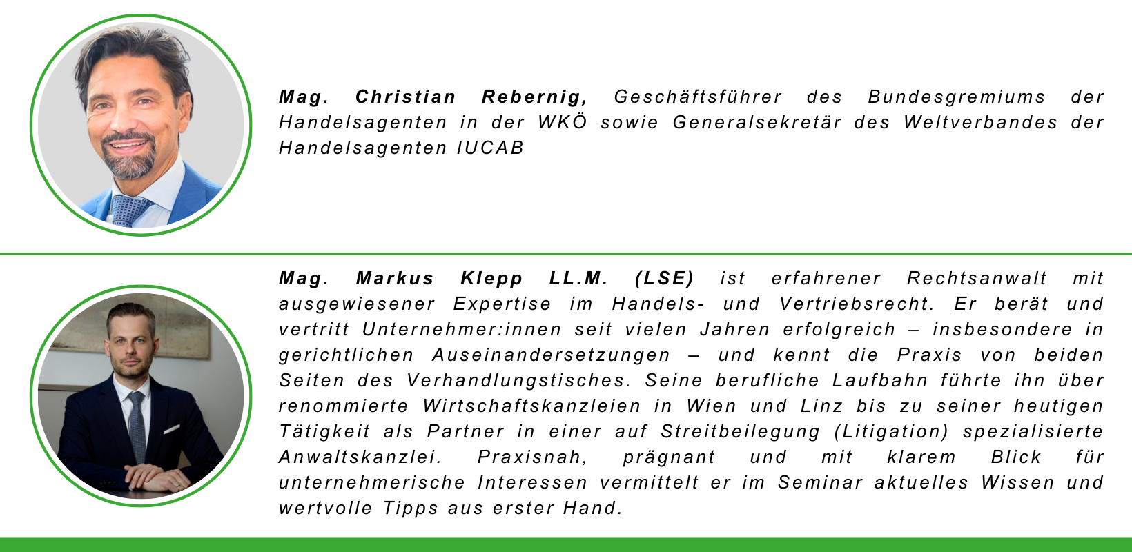 Das Seminar zeigt Ihnen daher die in der Praxis am häufigsten auftretende Problembereiche der Beziehung eines Sales Agents zum Geschäftspartner auf und informiert Sie über die geltende Rechtslage und die vertraglichen Gestaltungsmöglichkeiten. Damit Sie wissen, was Sie unterschreiben.