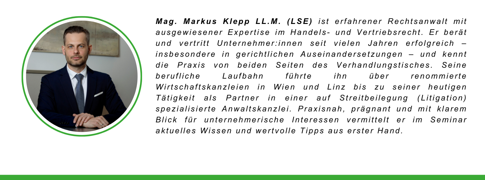 Aufbauend auf Modul 1 (Rechtliche Rahmenbedingungen für Sales Agents) werden Ihnen in diesem Live-Online Seminar die Details zur Entlohnung für Ihre Tätigkeit als Sales Agent nähergebracht. Ziel ist es, durch eine vorteilhafte Vertragsgestaltung, korrekte Abrechnung und das richtige Verhalten im Konfliktfall Ihre Ansprüche zu wahren. Das gilt insbesondere in Hinblick auf Ihre in der Praxis gegenüber wirtschaftlich stärkeren Geschäftspartnern oft eingeschränkte Verhandlungsposition. Besonderes Augenmerk wird auch auf die Voraussetzungen des Ausgleichsanspruchs gemäß § 24 HvertrG bei Vertragsbeendigung gelegt.