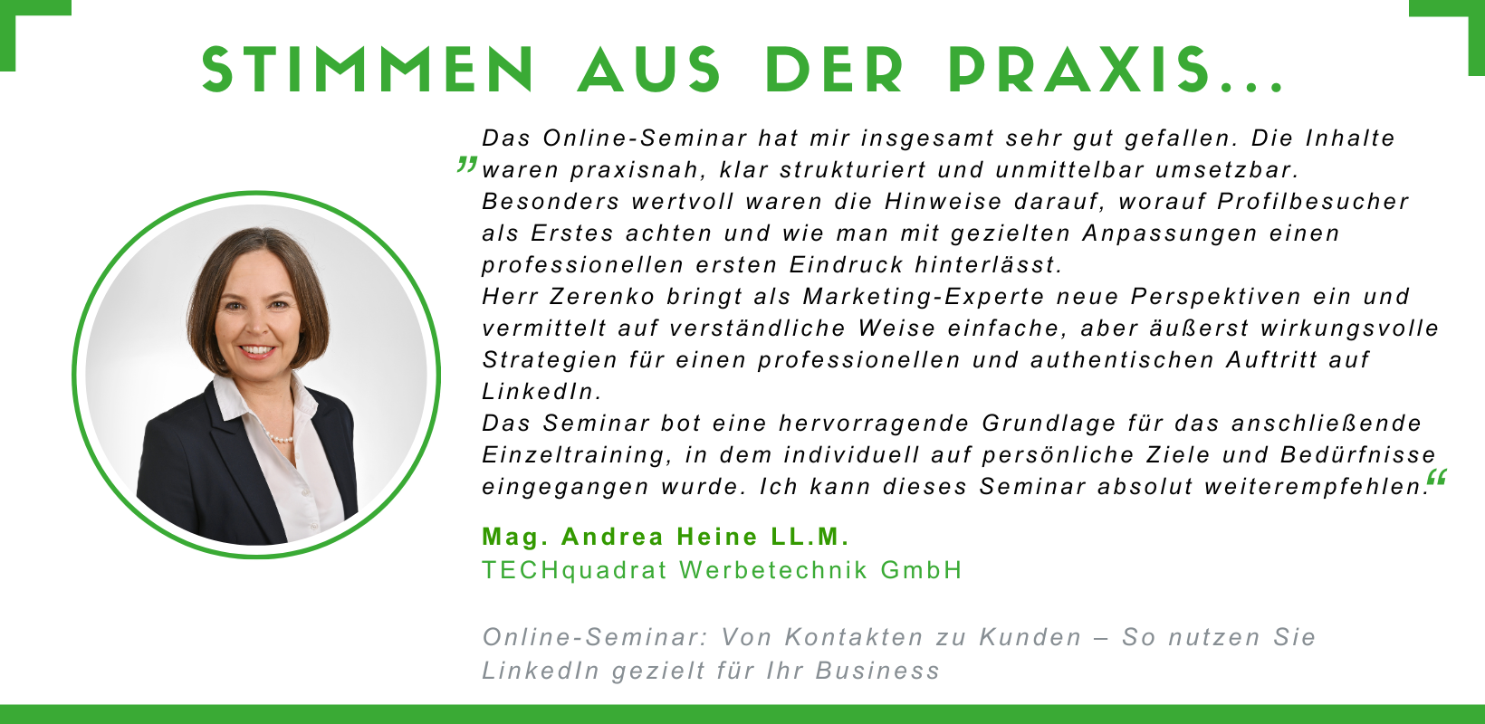 Viele Unternehmer:innen sind auf LinkedIn registriert, posten ab und zu – und wundern sich, warum keine echten Anfragen kommen. Dieser Praxis-Workshop zeigt Ihnen, wie Sie mit einem professionellen Auftritt und einer klaren Kontaktstrategie gezielt neue Kundinnen und Kunden gewinnen.